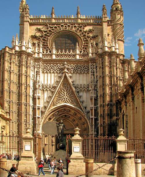 Vor dem Portal eine Nachbildung der Giralda, die oben rechts auf dem Hauptturm steht und als Minarett das Wahrzeichen Sevillas darstellt |
